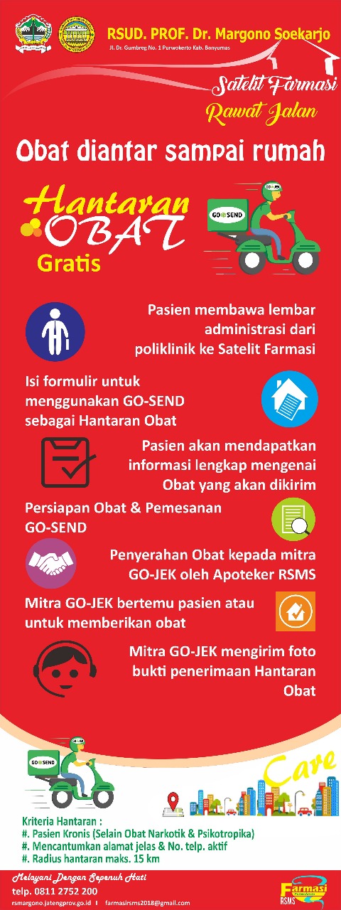 RSMS bekerjasama dengan Go-Jek untuk memberikan layanan #Cepat-HantarObat dalam rangka meningkatkan mutu pelayanan terhadap pasien rawat jalan, sehingga pasien tidak perlu mengantri, hanya dengan menginformasikan kesediaan obatnya diantarkan lalu diedukasi oleh apoteker obat apa saja yang nanti akan diantar dan aturan pakainya lalu pasien menunggu di rumah, obat akan diantar sampai alamat. Untuk tahap awal maka criteria obat diantar adalah obat bagi pasien dengan penyakit kronis, yang memiliki nomer HP yang bisa dihubungi, dengan Radius 15 KM. Pasien dapat menikmati layanan ini dengan criteria tersebut diatas dengan tanpa dipungut biaya.
