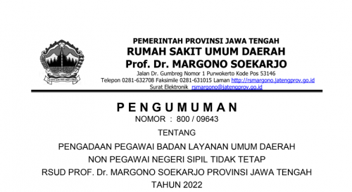 Pengumuman Pengadaan Pegawai Badan Layanan Umum Daerah Non Pegawai Negeri Sipil Tidak Tetap RSUD Prof. Dr. Margono Soekarjo Provinsi Jawa Tengah Tahun 2022