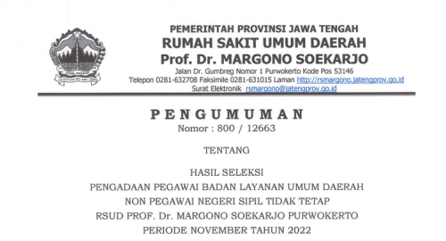 Pengumuman Hasil Seleksi Pengadaan Pegawai Badan Layanan Umum Daerah Non Pegawai Negeri Sipil Tidak Tetap RSUD Prof. Dr. Margono Soekarjo Purwokerto Periode November Tahun 2022